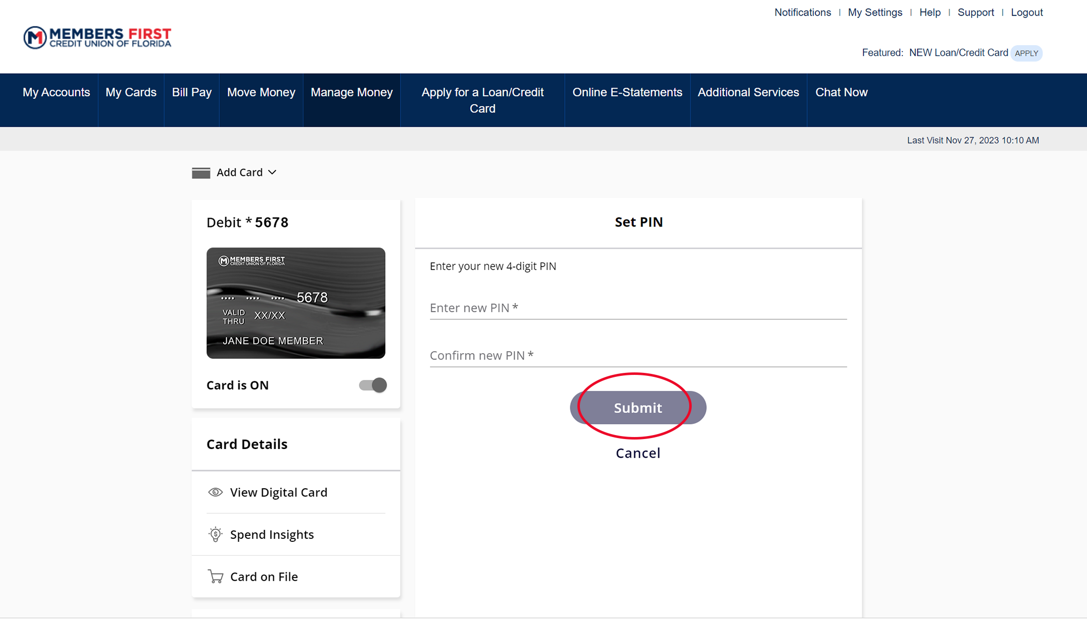 In order for you to be able to manage your Members First card, you must be enrolled in Members First Credit Union of Florida's internet banking. Once you're enrolled, you can start to manage your card within internet banking or our mobile banking app by navigating to 'My Cards'.